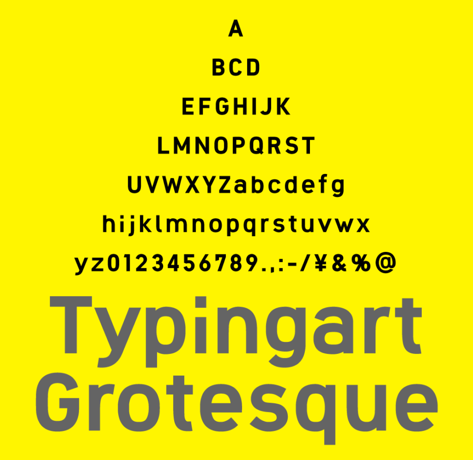 エックスハイトを高めにし、大文字と小文字の差を縮めたことでロゴタイプとして利用しやすくなっています。また文字内の空間(フトコロ)、面取りなど各種視覚調整を施し、温かみのあるグロテスク・サンセリフ を目指しています。