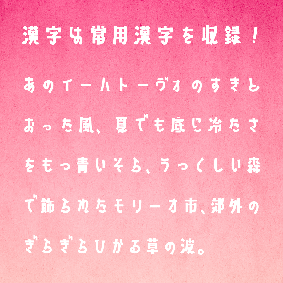 和文フォント「山びこやま」 2025年5月8日 typingart Fonts 日本語(和文)フォント「山びこやま」は、やんわりさわやかなディスプレイフォントです。教育漢字1026文字収録、商用利用可能、やわらかくて親しみやすいフォルム! お試し用フリー版はこちら→ STORES.jp BOOTH 漢字を含む有料版は、オンラインストアにてダウンロード販売中。 詳しくは下記リンクボタンよりご覧ください。